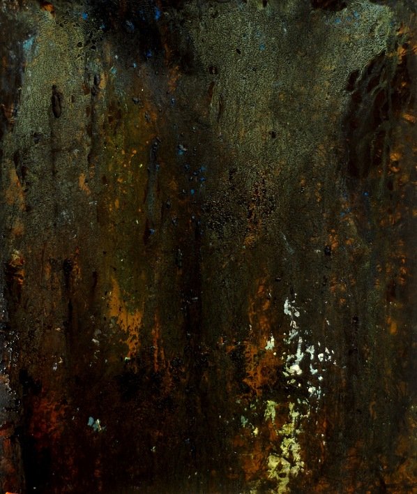 This work is quite different from my current works and it really should be as it is an example of my earlier works, from my grad school years. I was experimenting a lot with layering at that time. This painting is layered with washes of acrylic paint but also inks and iridescent pigments in various media. I was also using mostly draughtsman’s film so that light could be transferred through the material for illuminating effects that changes the painting depending on the light. The film is a type of translucent myler that has ‘teeth’ and a rough texture that can be painted on with water soluble paints.